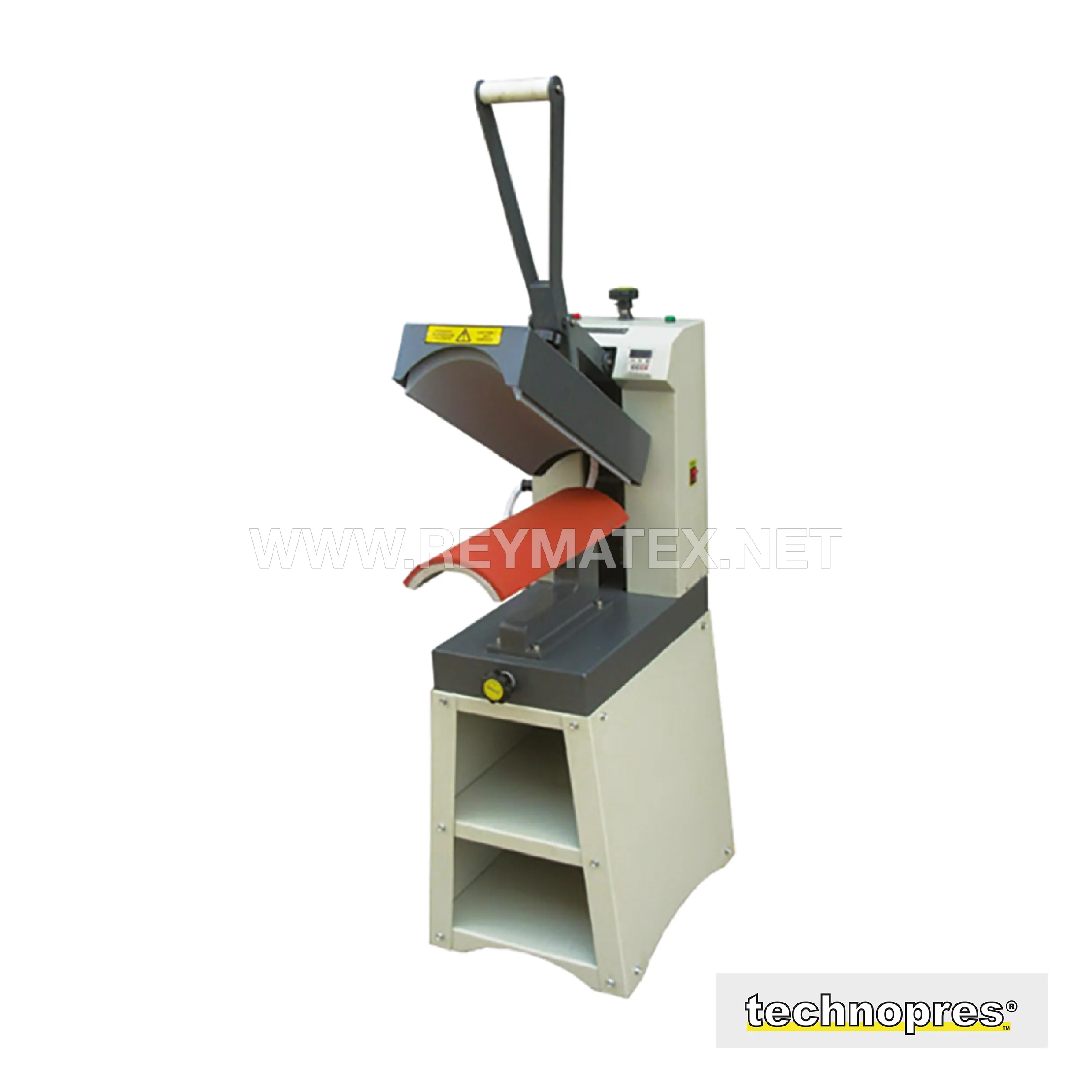 Máquina de transfer de presión normal con plato especial para la colocación e transfers en perneras de pantalón.