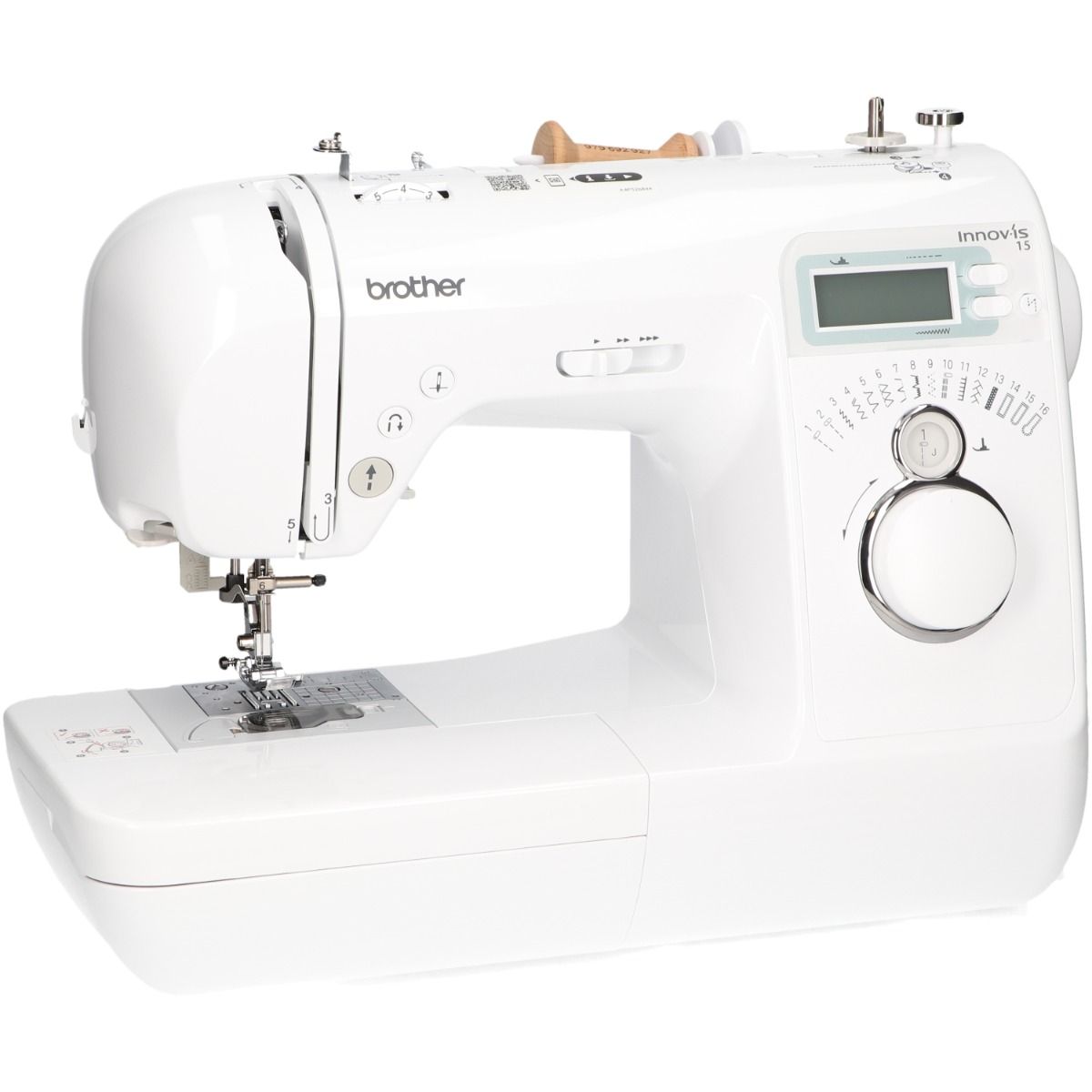 La Brother Innovis 15 es una máquina de coser electrónica ideal para principiantes y usuarios intermedios. Ofrece 16 puntadas, incluyendo puntadas utilitarias y decorativas, y 3 tipos de ojales automáticos en un solo paso. Su pantalla LCD muestra la configuración de puntadas, mientras que el selector electrónico permite elegir puntadas rápidamente. Otras características incluyen un enhebrador automáticobobina de ajuste rápidoluz LED, y un sistema de alimentación de 7 puntos para garantizar costuras precisas en diversos tejidos.