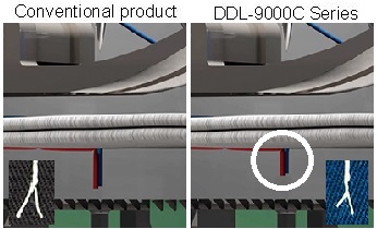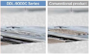 Se utiliza el sistema de cuchillas rotativas de doble filo, cuyos bordes se cruzan entre sí directamente bajo el punto de entrada de la aguja, para cortar el hilo, consiguiendo que el hilo que queda en el material sea de 3 mm. The grooved cam system is adopted to enable forcible release of the thread trimmer even if the thread trimmer locks. The picker device is also adopted. The picker device secures a sufficient length of needle thread, as well as it stabilizes the length of thread remaining on the material.